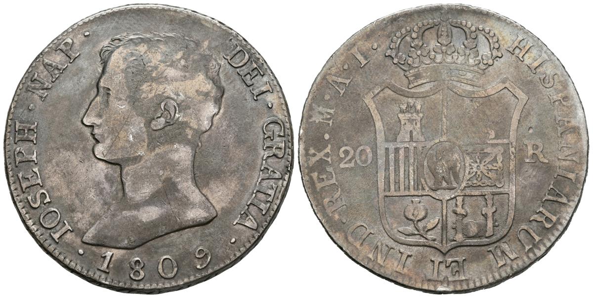 JOSE NAPOLEON. 20 Reales. (Ar. 26,87g/39mm). 1809. Madrid AI. (Cal-24). MBC/MBC-.