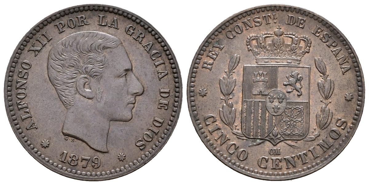 ALFONSO XII. 5 Céntimos. 1879. Barcelona OM. Cal-73. Ae. 5,18g. EBC/EBC+.
