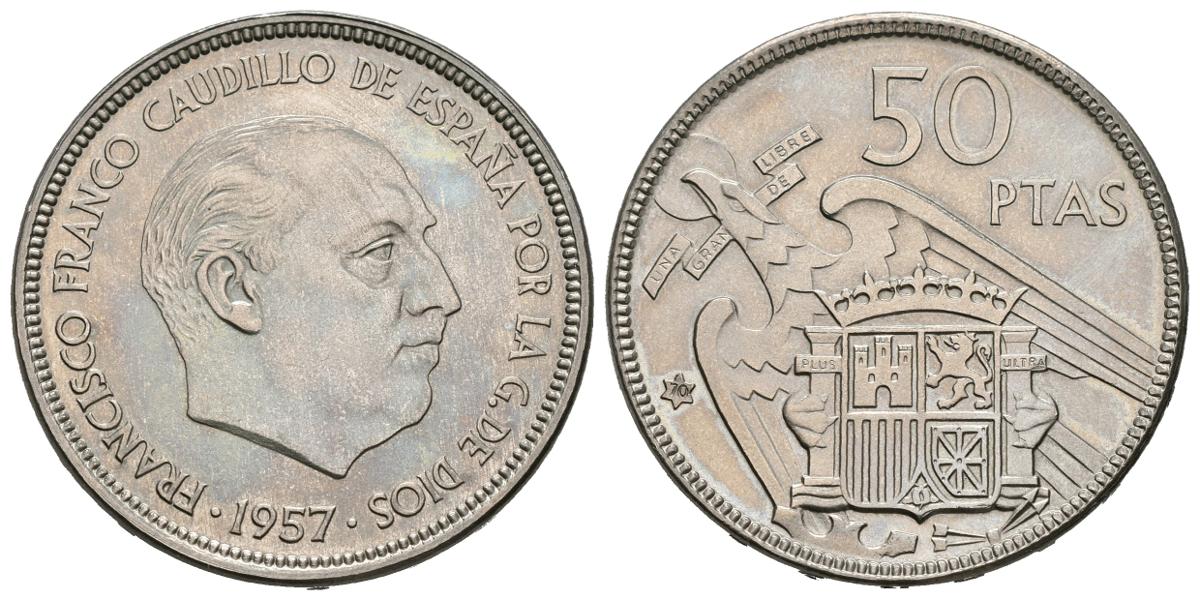 ESTADO ESPAÑOL. 50 Pesetas. 1957 *70. Procedente de tira F.N.M.T. Cal-23. 12,72g. Suave tono. PROOF.