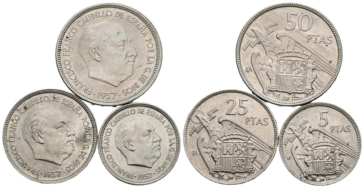 ESTADO ESPAÑOL. 1957. Barcelona BA. I Exposición Iberoamericana de Numismática. (5 Ptas, 25 Ptas y 50 Ptas). Cal-139. Rayitas. MBC+/EBC-.