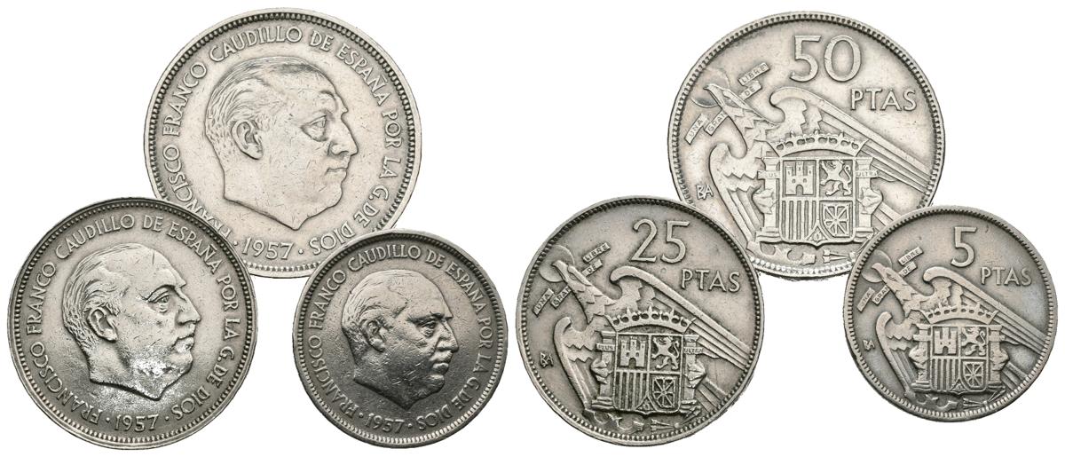 ESTADO ESPAÑOL. Serie completa de 5, 25 y 50 Pesetas. 1957. Barcelona BA. I Exposición Iberoamericana de Numismática. Cal-139. Limpiadas. MBC+.