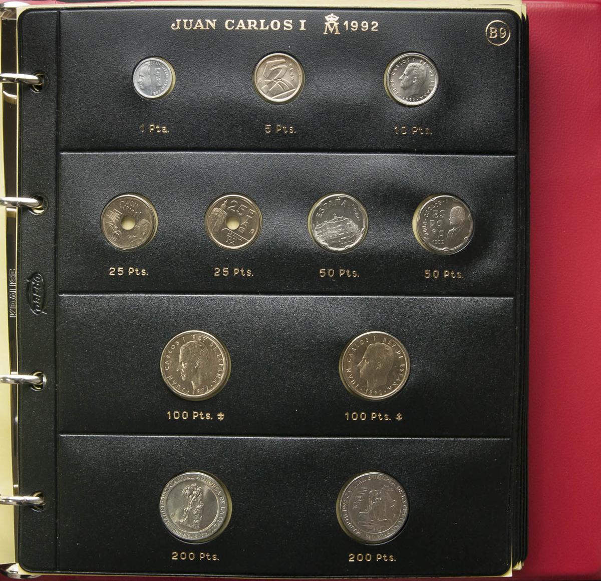 JUAN CARLOS I. Colección completa desde 1975 *76 hasta 2001 presentados en dos álbumes Pardo. Incluye la serie E-87, pruebas de 500 Pesetas y 2000 Pesetas (1994, 1996 y 1998). Practicamente todo sin circular. A EXAMINAR.