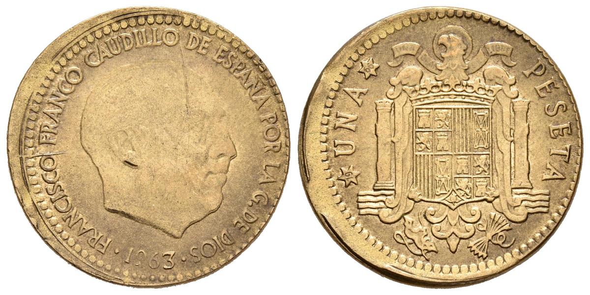 ESTADO ESPAÑOL. 1 Peseta. 1963 *19-66. Acuñación desplazada 2 mm y canto corona. Cal-93. 3,40g. EBC.