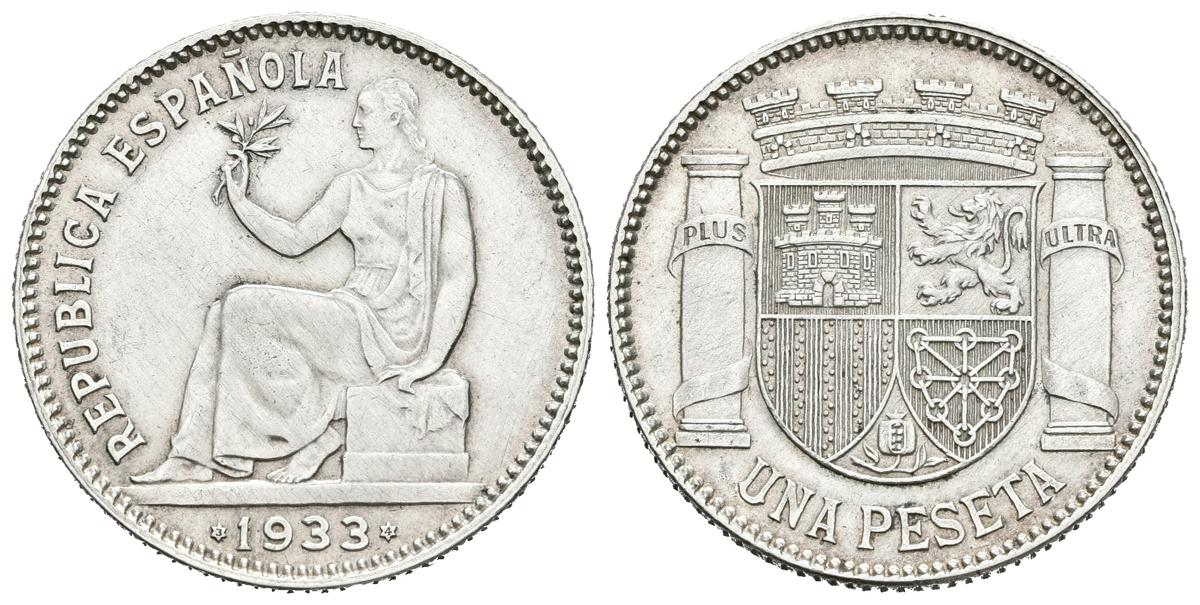II REPUBLICA. 1 Peseta. 1933 *3-4. Reverso girado 210º. Cal-1. Ar. 5,02g. Levemente frotada. MBC+.