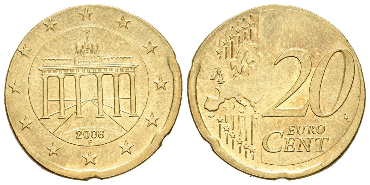 ALEMANIA. 20 Céntimos. 2008. Acuñados sobre una moneda de 10 Céntimos, su peso es de 4,08g (10 cts) cuando el peso de esta debería de ser 5,70g (20 cts). SC. Muy rara.