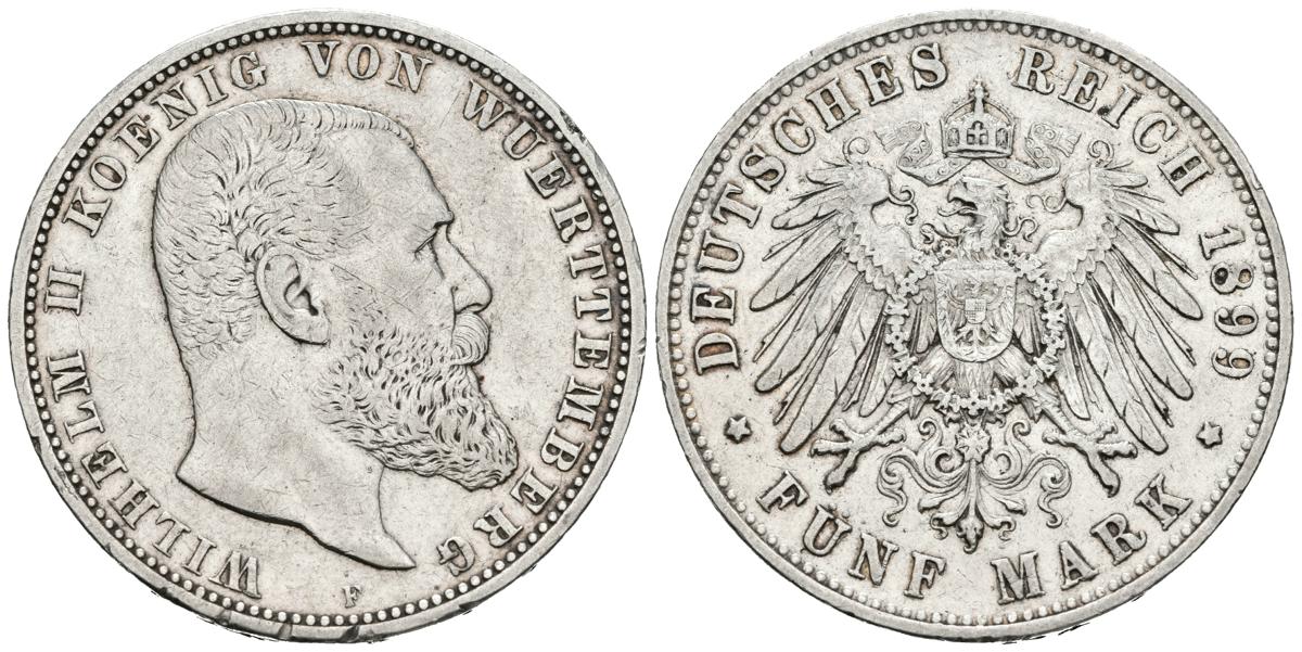 ALEMANIA. 5 Marcos. (Ar. 27,74g/37mm). 1899. Stuttgart F. (Km#632). MBC.