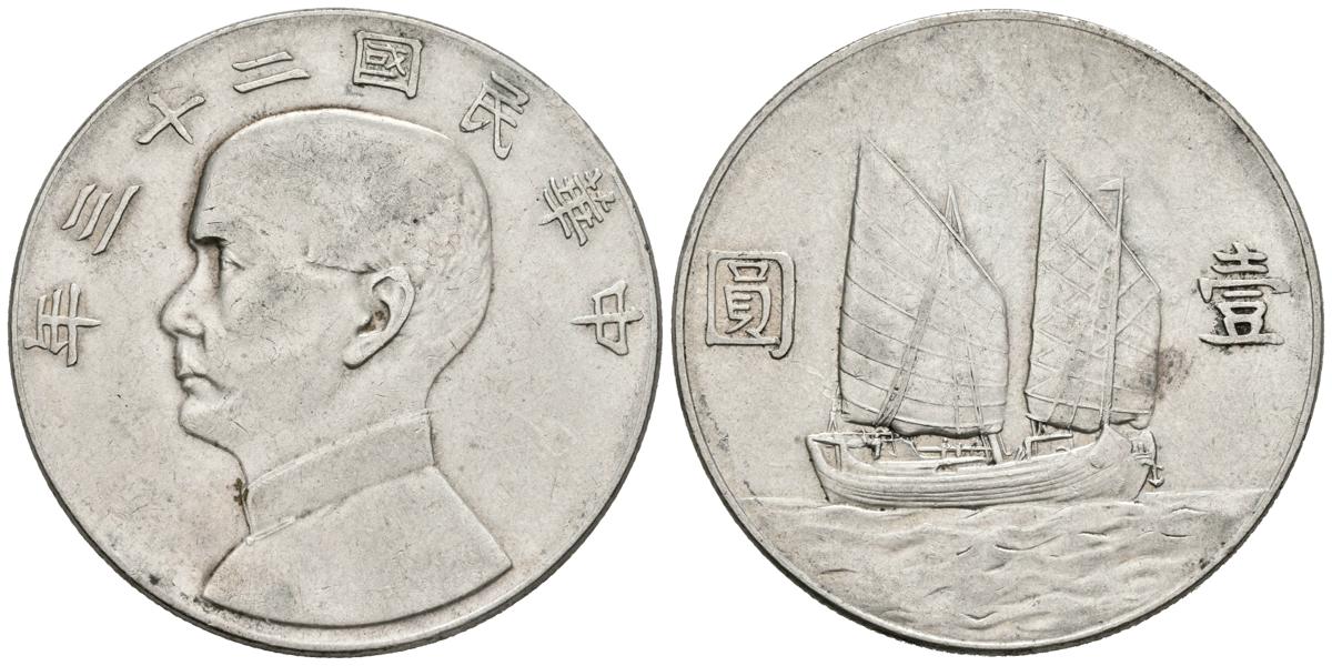 CHINA. Sun Yat-sen. 1 Dollar. 1933, Año=22. Km#Y345; Kann 624. Ar. 26,87g. Marquitas. MBC.