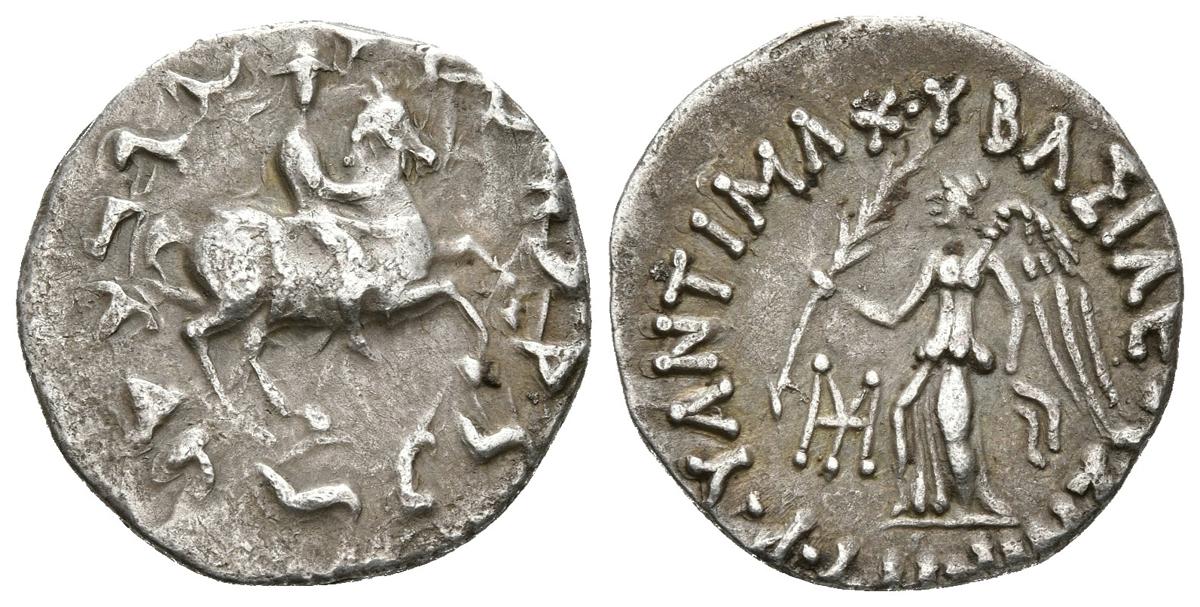 BAKTRIA. Antimachos II Nikephoros. Dracma. 160-155 a.C. Indo-Grecia. A/ Antimachos sobre caballo cabalgando a derecha y alrededor leyenda Karosthi. R/ Nike estante a izquierda portando corona y palma, a izquierda monograma. Bopearachchi 1F; HGC 12-124. Ar. 2,35g. MBC/MBC+.
