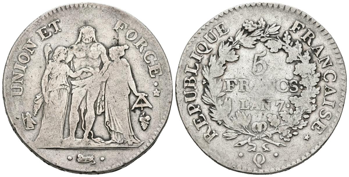 FRANCIA. 5 Francs. L´An 7. Perpignan Q. Gad. 563. Ar. 24,61g. BC+.