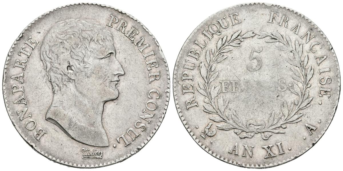 FRANCIA. 5 Francs. An XI. París A. Gad. 577; Km#650.1. Ar. 24,87g. Golpecitos en el canto. MBC-.