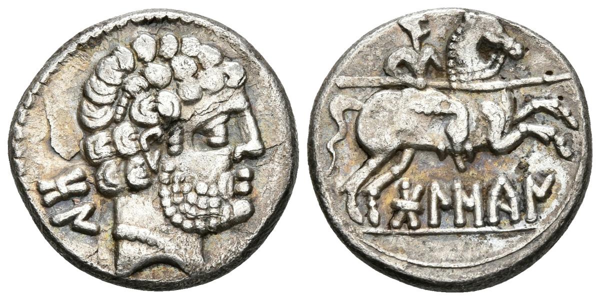 BOLSCAN. Denario. 180-20 a.C. Huesca. A/ Cabeza barbada a derecha, detrás letras ibéricas BoN. R/ Jinete con lanza a derecha, debajo leyenda ibérica. FAB-1911. Ar. 3,17g. Ligero tono irisado. Hoja en anverso. MBC+.