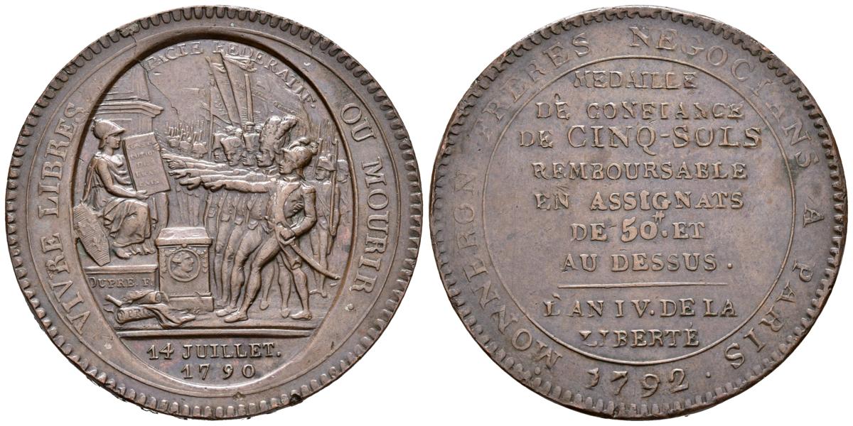 FRANCIA. 5 Sols. 1792. Birmingham. A/ Escena del juramento de la fiesta de la dereración. VIVRE LIBRES-OU MOURIR. R/ Alrededor: 1792 MONNERON FRERES NEGOCIANS A PARIS, en el centro: MEDAILLE/ DE CONFIANCE/ DE CINQ-SOLS/ REMBOURSABLE/ EN ASSIGNATS/ DE 50#. ET/ AU DESSUS./ L'AN IV. DE LA/ LIBERTÉ. Maz.145; Km#Tn31. Ae. 27,34g. MBC+.