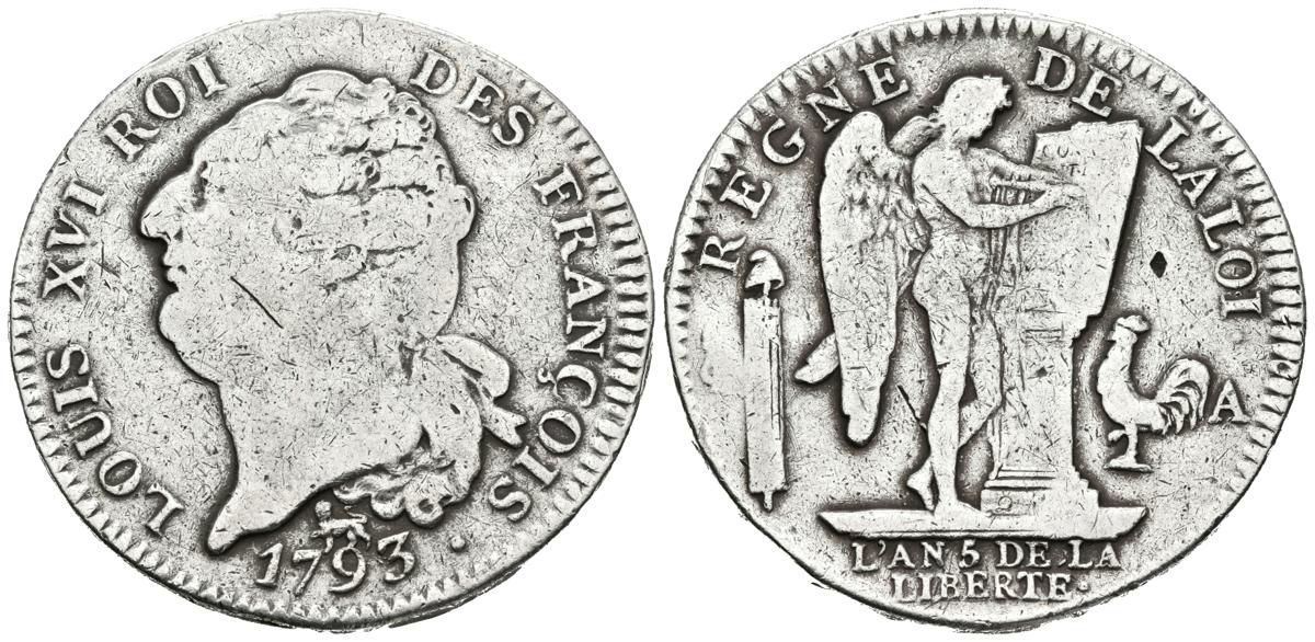 FRANCIA. Louis XVI. Ecu de 6 Livres. 1793. París A, An 5. Dupl. 1718; Ci. 2238; Gad. 55. Ar. 28,83. BC+/MBC-.
