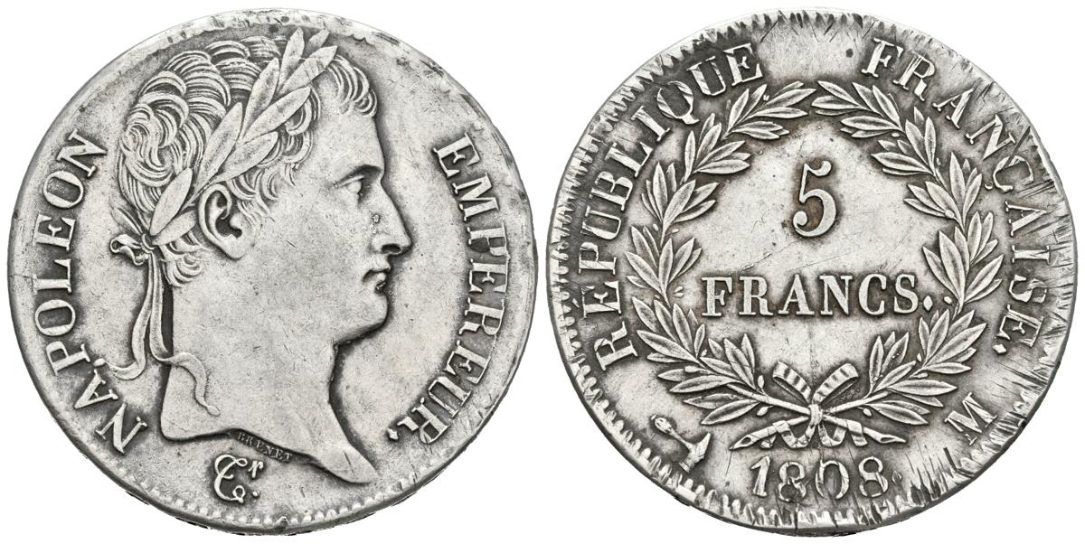 FRANCIA. Napoleón. 5 Francs. 1808. Toulouse M. Dav. 84, Gad. 583 l. Ar. 25,00g. EBC-.