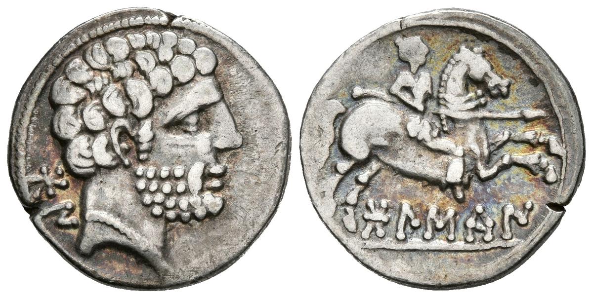 BOLSCAN. Denario. 180-20 a.C. Huesca. A/ Cabeza barbada a derecha, detrás letras ibéricas BoN. R/ Jinete con lanza a derecha, debajo leyenda ibérica. FAB-1911. Ar. 4,11g. Bonito tono irisado. MBC+.