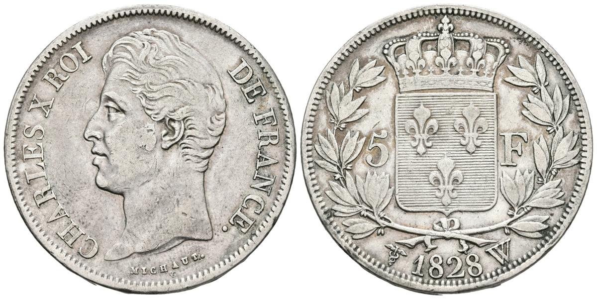 FRANCIA. 5 Francs. 1828. Lille W. Gad. 644. Ar. 25,00g. MBC-/MBC.