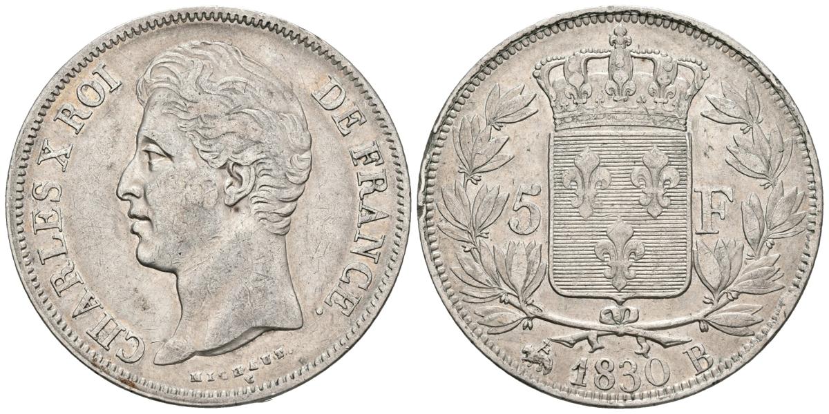 FRANCIA. 5 Francs. 1830. Rouen B. F. 311/41. Ar. 24,88g. Golpecitos en el canto. MBC-.