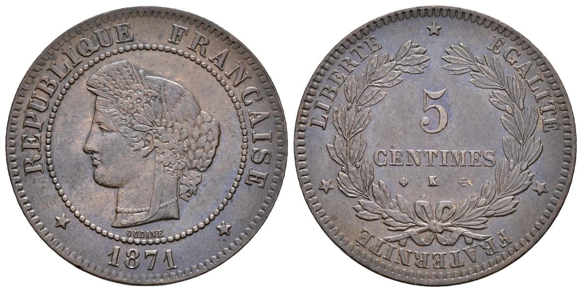 FRANCIA. 5 Centimes. 1871 K. (Bordeaux). Km#821.2; Gad. 265a. Ae. 4,95g. EBC-. Rara.