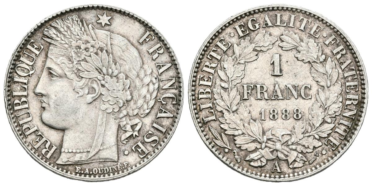 FRANCIA. 1 Franc. 1888. París A. Km#822.1; Gad. 465a. Ar. 5,01g. Leves marquitas. EBC-.