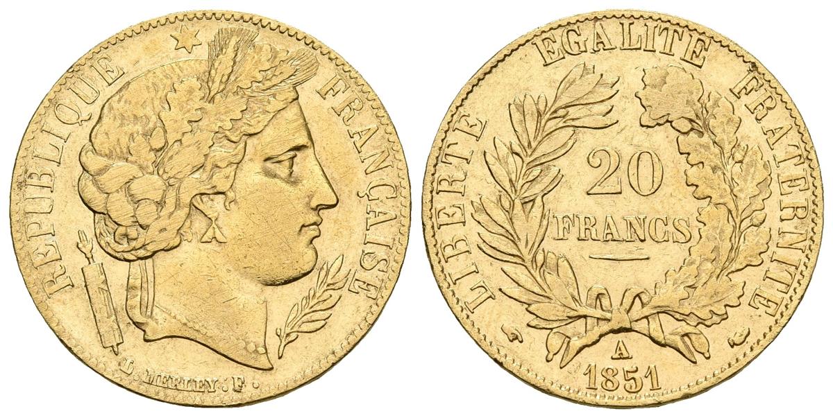 FRANCIA. 20 Francos. (Au. 6,37g/21mm). 1851. París A. (Km#762). MBC-. Limpiada.