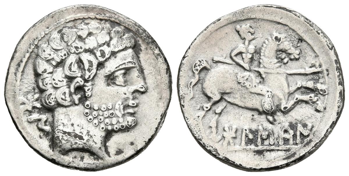 BOLSCAN. Denario. 180-20 a.C. Huesca. A/ Cabeza barbada a derecha, detrás letras ibéricas BoN. R/ Jinete con lanza a derecha, debajo leyenda ibérica BoLSCaN. FAB-1911. Ar. 3,99g. MBC.