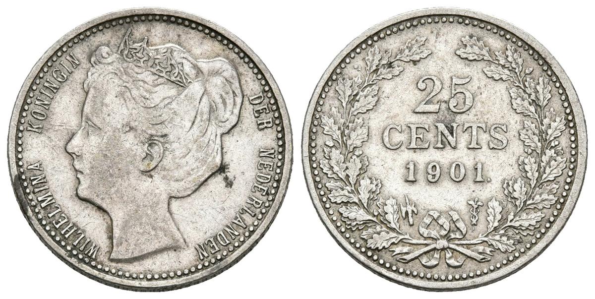 HOLANDA. 25 Cents. 1901. Km#120.1. Ar. 3,56g. Raya en anverso. MBC. Escasa.