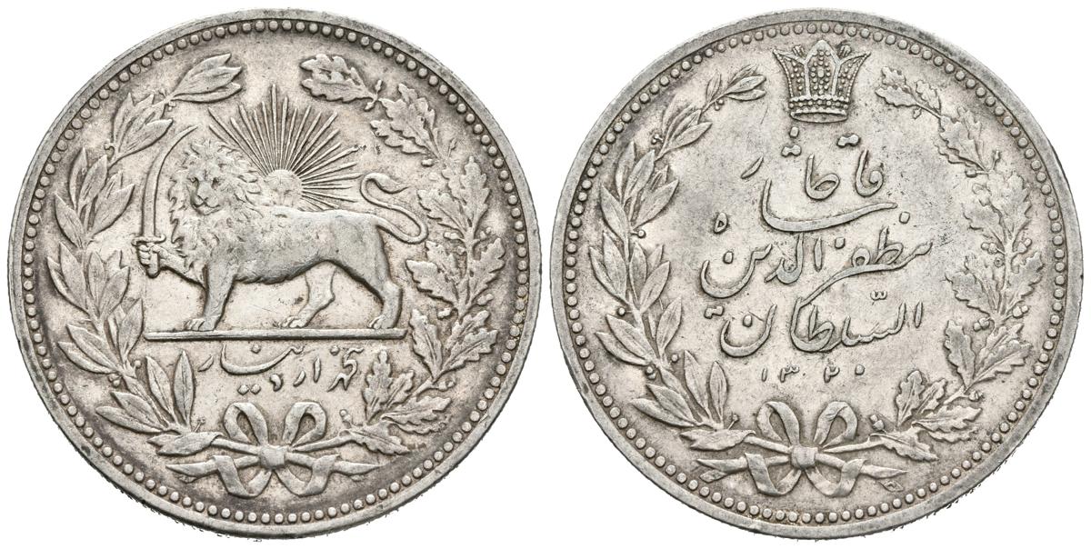 IRAN. Muzaffar al-Din Shah. 5000 DInars. 1320 H-1902. Km#976. Ar. 22,97g. MBC.
