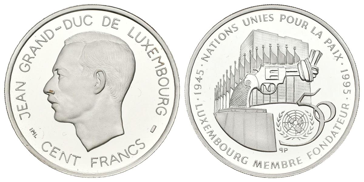 LUXEMBURGO. 100 Francs. 1995. 50 Aniversario de las Naciones Unidas. Km#70. Ar. 15,90g. PROOF.