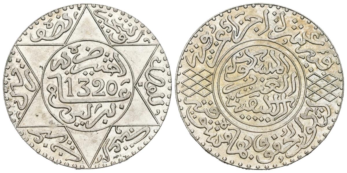 MARRUECOS. Abd Al-Aziz. 1/2 Rial ( 5 Dirhams). 1320 H-1902. Km#21.2. Ar. 12,40g. Leve golpecito en anverso. EBC+.
