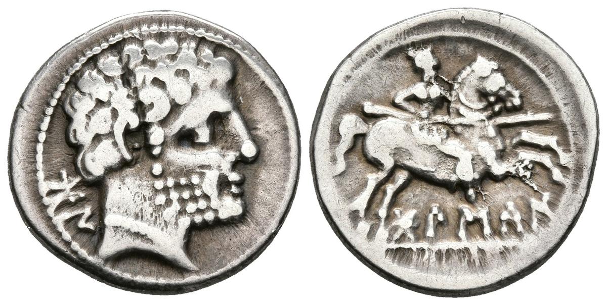 BOLSCAN. Denario. 180-20 a.C. Huesca. A/ Cabeza barbada a derecha, detrás letras ibéricas BoN. R/ Jinete con lanza a derecha, debajo leyenda ibérica BoLSCaN. FAB-1911. Ar. 4,05g. MBC.