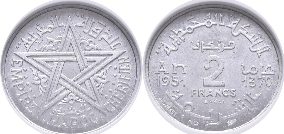MARRUECOS. 2 Francs. 1370 H (1951). Essai. Km#E38. Centificada por NGC como MS64. SC. Ex Carl F. Chirico Jr. Collection.