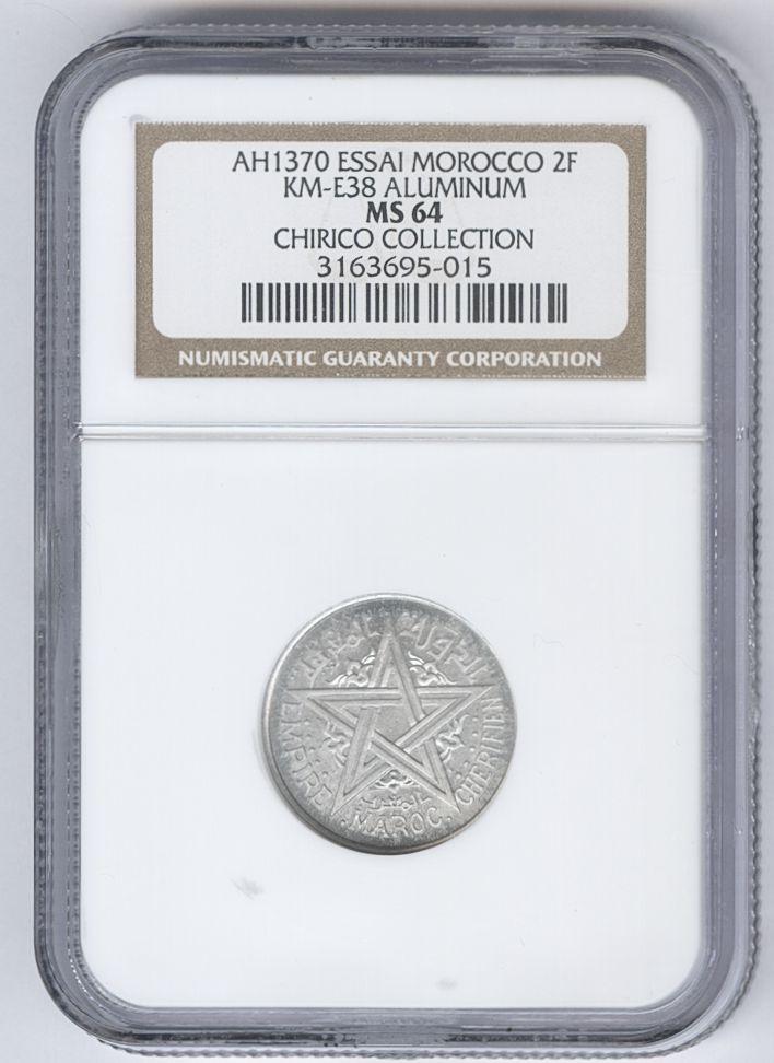 MARRUECOS. 2 Francs. 1370 H (1951). Essai. Km#E38. Centificada por NGC como MS64. SC. Ex Carl F. Chirico Jr. Collection.