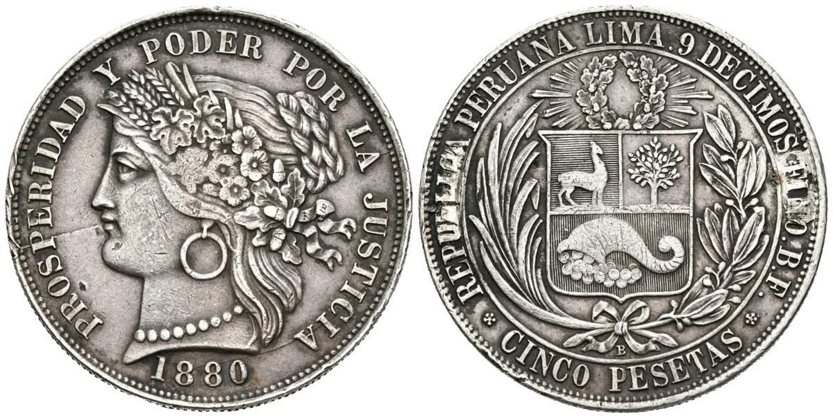 PERU. 5 Pesetas. (Ar. 24,98g/36mm). 1880 B. (Km#201.1). MBC.