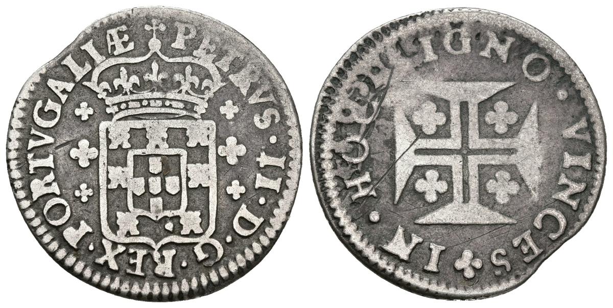 PORTUGAL, Pedro II (1683-1706). Tostao. (Ar. 3,57g/23mm). Lisboa. (Gomes 48.10). MBC-.
