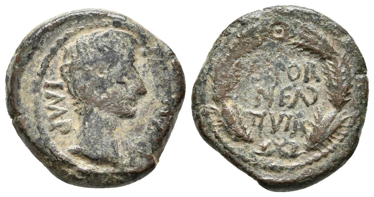 CAESARAUGUSTA. Cuadrante. Epoca de Augusto. 27 a.C.-14 d.C. Zaragoza. A/ Cabeza desnuda de Augusto a derecha. AVGVSTVS.IMP. R/ Dentro de láurea. M.POR.CN.FAD.II.VIR. FAB-341. Ae. 3,50g. BC.