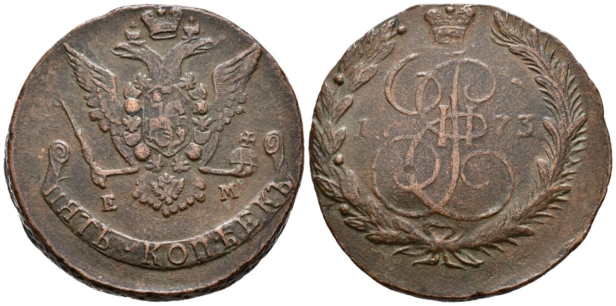 RUSIA. Catherina II. 5 Kopeks. 1773. Ekaterinburg EM. Km#59.3; Bitkin 623. Ae. 51,62g. MBC+.