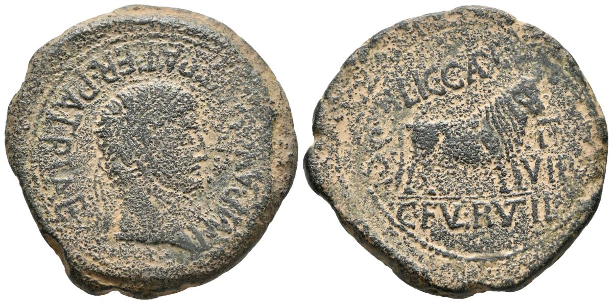 CALAGURRIS. As. Epoca de Augusto. 27 a.C.-14 d.C. Calahorra (La Rioja). A/ Cabeza laureada de Augusto a derecha. IMP.AVGVST.PATER.PATRIAE. R/ Toro a derecha. M.LIC.CAPEL.C.FVL.RVTIL.II.VIR.M.C.I. FAB-420. Ae. 17,57g. BC+.