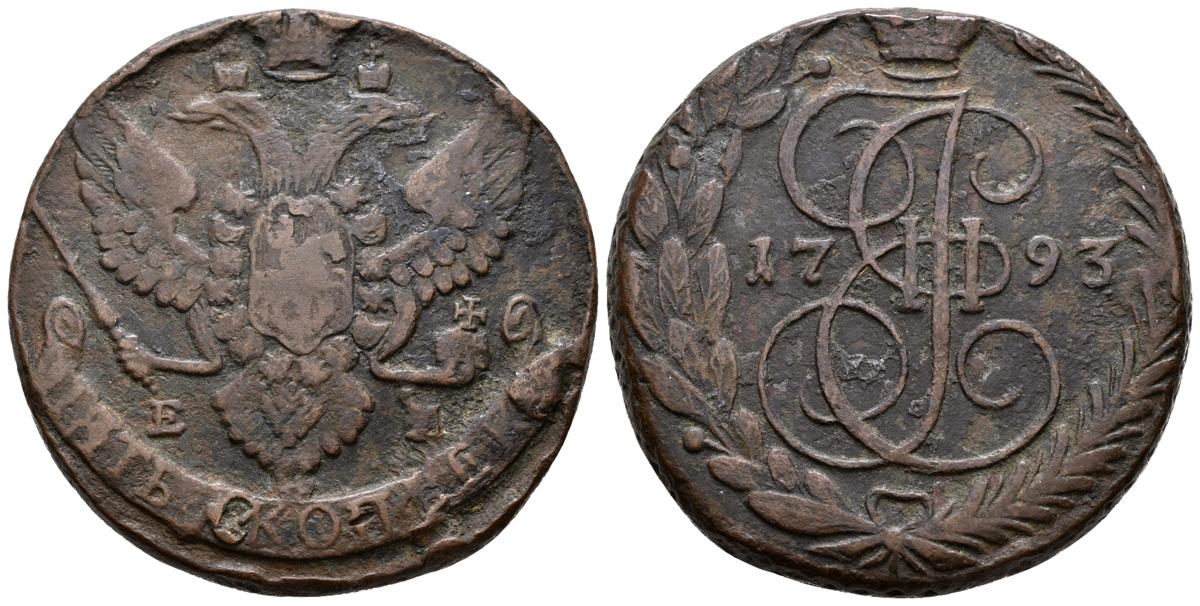 RUSIA. Catherina II. 5 Kopeks. 1793. Ekaterinburg EM. Km#59.3; Bitkin 865. Ae. 49,75g. MBC+.