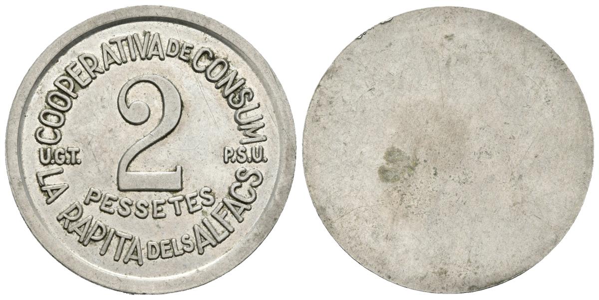 LA RAPITA DELS ALFACS. 2 Pesetas. Cooperativa de Consum. U.G.T.-P.S.U. AL-2799. Cu/Ni. 6,13g. EBC-. Rara.