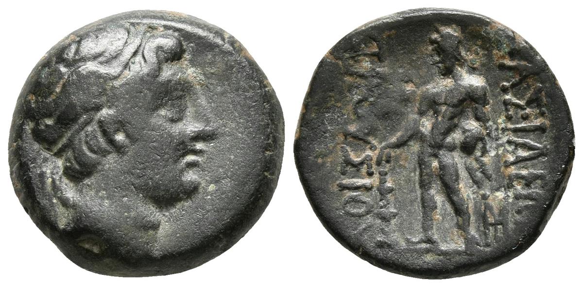 BITHYNIA. Prusias II. Ae16. 182-149 a.C. A/ Cabeza de Prusias a derecha con diadema alada. R/ Herakles estante a izquierda sosteniendo maza y piel de león. Rec gén, p. 225, 25; HGC 7, 643. Ae. 3,70g. MBC.