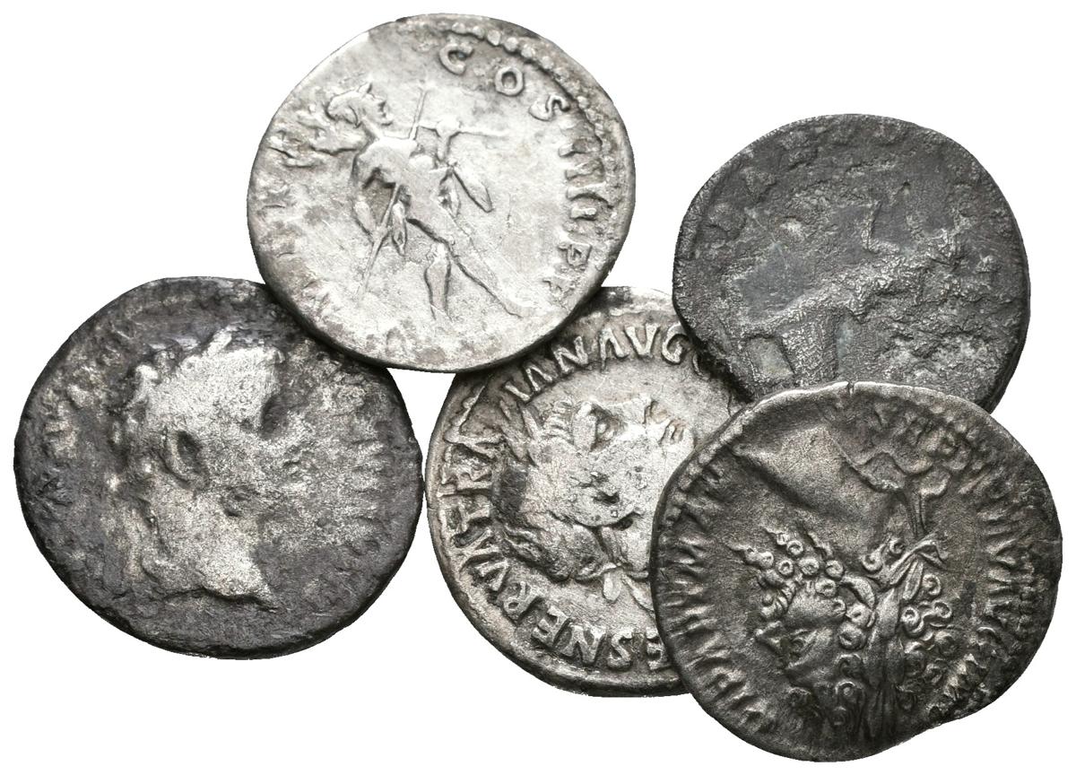 IMPERIO ROMANO. Lote compuesto por 5 denarios de los siguientes emperadores: Tiberio, Trajano (2) y Septimio Severo (2). Todos diferentes. Ar. A EXAMINAR.