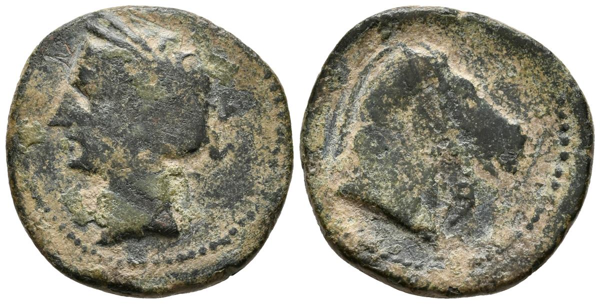 CARTAGONOVA. Calco. 220-215 a.C. Cartagena (Murcia). A/ Cabeza de Tanit a izquierda. R/ Cabeza de caballo a derecha, delante letra fenicia Bet. FAB-511. Ae. 9,56g. BC.