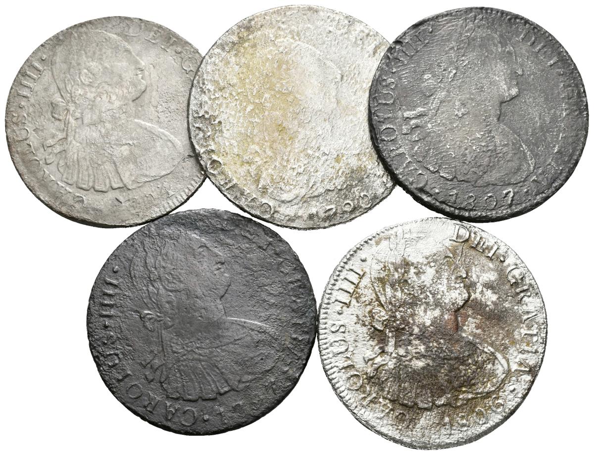 CARLOS IV. Lote compuesto por 5 monedas de 8 Reales, conteniendo: 1790 Potosí PR (busto de Carlos III), 1797 Lima IJ, 1804 México TH, 1806 México TH y 1807 México TH. Todas con oxidaciones marinas. Ar. BC+. A EXAMINAR.