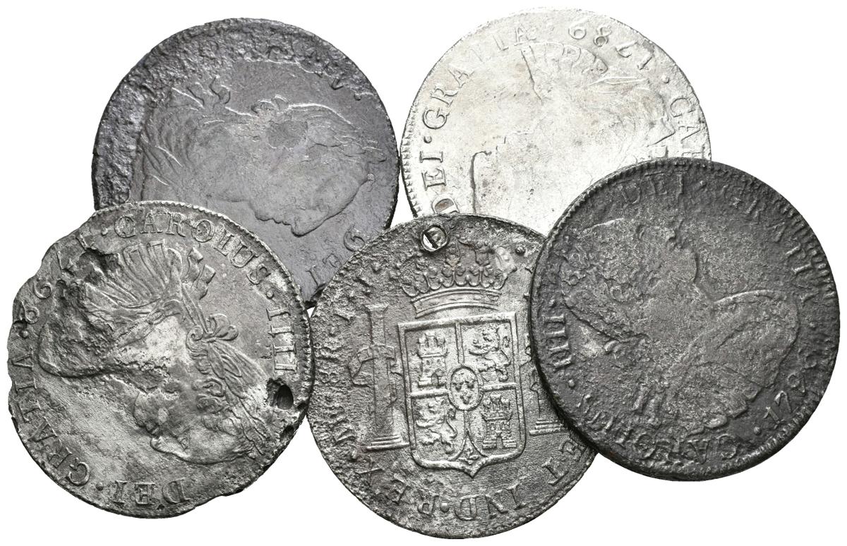 CARLOS IV. Lote compuesto por 5 monedas de 8 Reales, conteniendo: 1789 Lima IJ (busto de Carlos III); 1790 México FM (busto de Carlos III); 1792 Guatemala M; 1794 Lima IJ y 1796 México FM. Todas presentan oxidaciones marinas. Ar. A EXAMINAR.