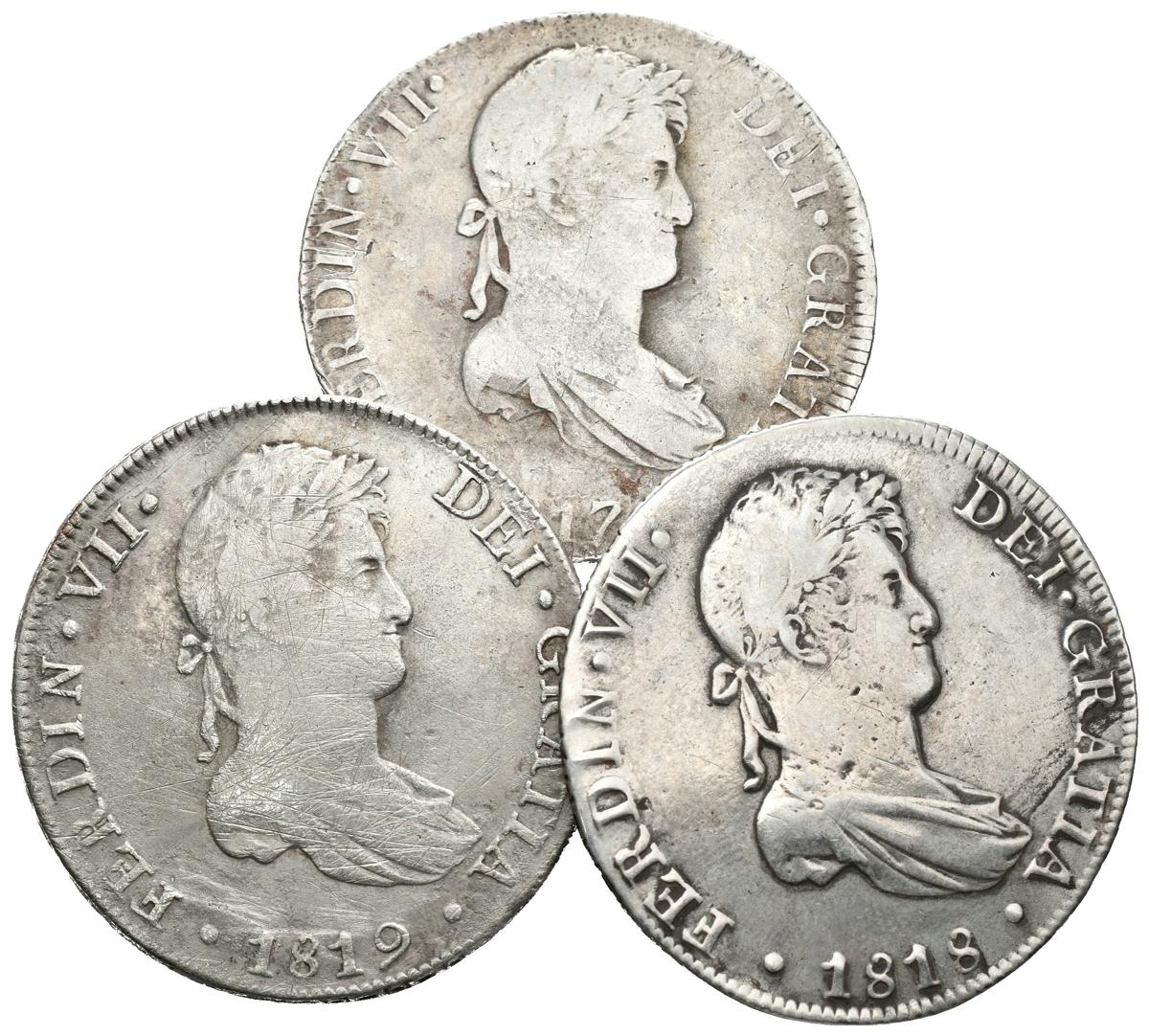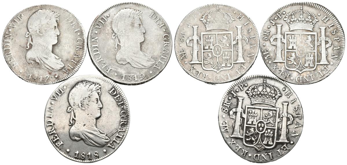 FERNANDO VII. Lote compuesto por 3 monedas de 8 Reales. 1817, 1818 y 1819 de Lima JP. Cal-485/486/487. Ar. Rayas y alguna con soldadura en el canto. A EXAMINAR.