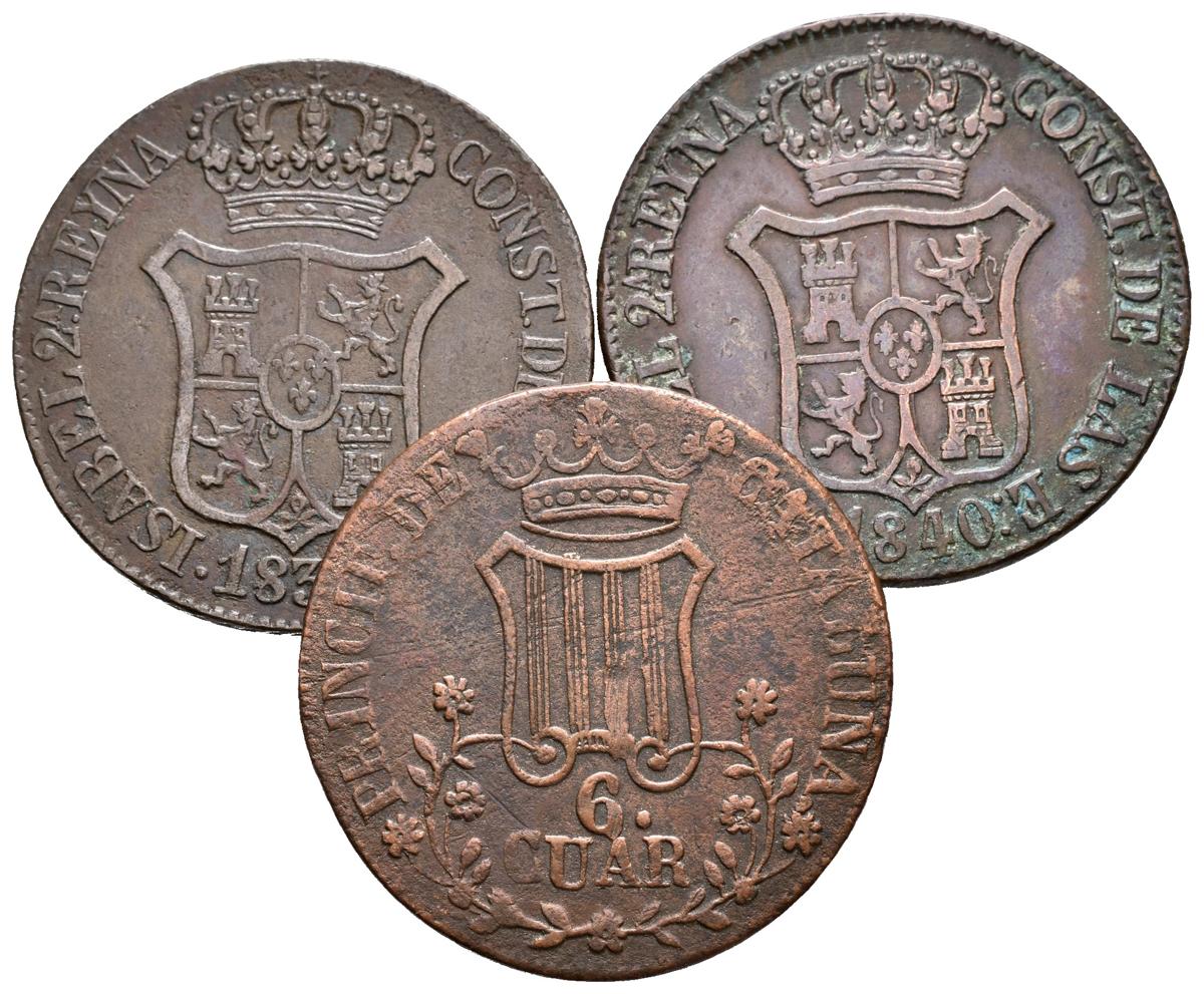 ISABEL II. Lote compuesto por 3 monedas de 6 Cuartos de 1838, 1840 y 1846 Barcelona. Ae. A EXAMINAR.