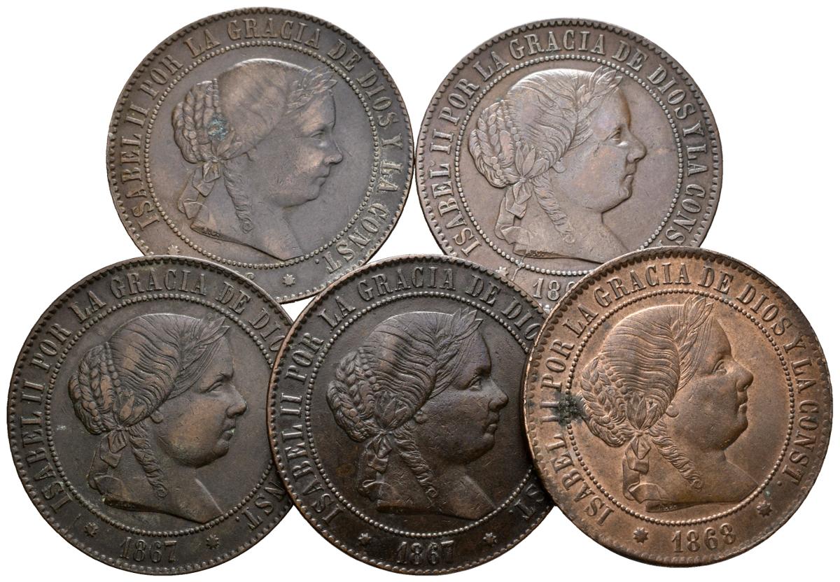 ISABEL II. Lote compuesto por 5 monedas de 5 Céntimos de Escudos, conteniendo: 1866, 1867 y 1868 Barcelona y 1867 y 1868 Sevilla. Ae. A EXAMINAR.