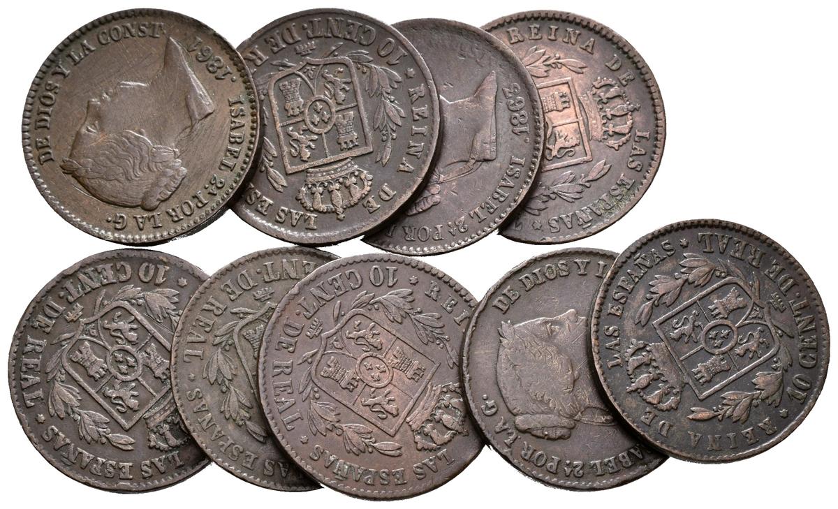ISABEL II. Lote compuesto por 9 monedas de 10 Céntimos de Real de 1855, 1856, 1857, 1859, 1860, 1861, 1862, 1863 y 1864 de Segovia. Ae. A EXAMINAR.