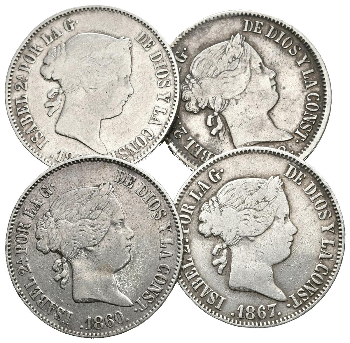 ISABEL II. Lote compuesto por 4 monedas, conteniendo: 1 Escudo 1867 Madrid; 10 Reales 1860 y 1863 Madrid y 50 Céntimos de Peso 1868. Ar. A EXAMINAR.