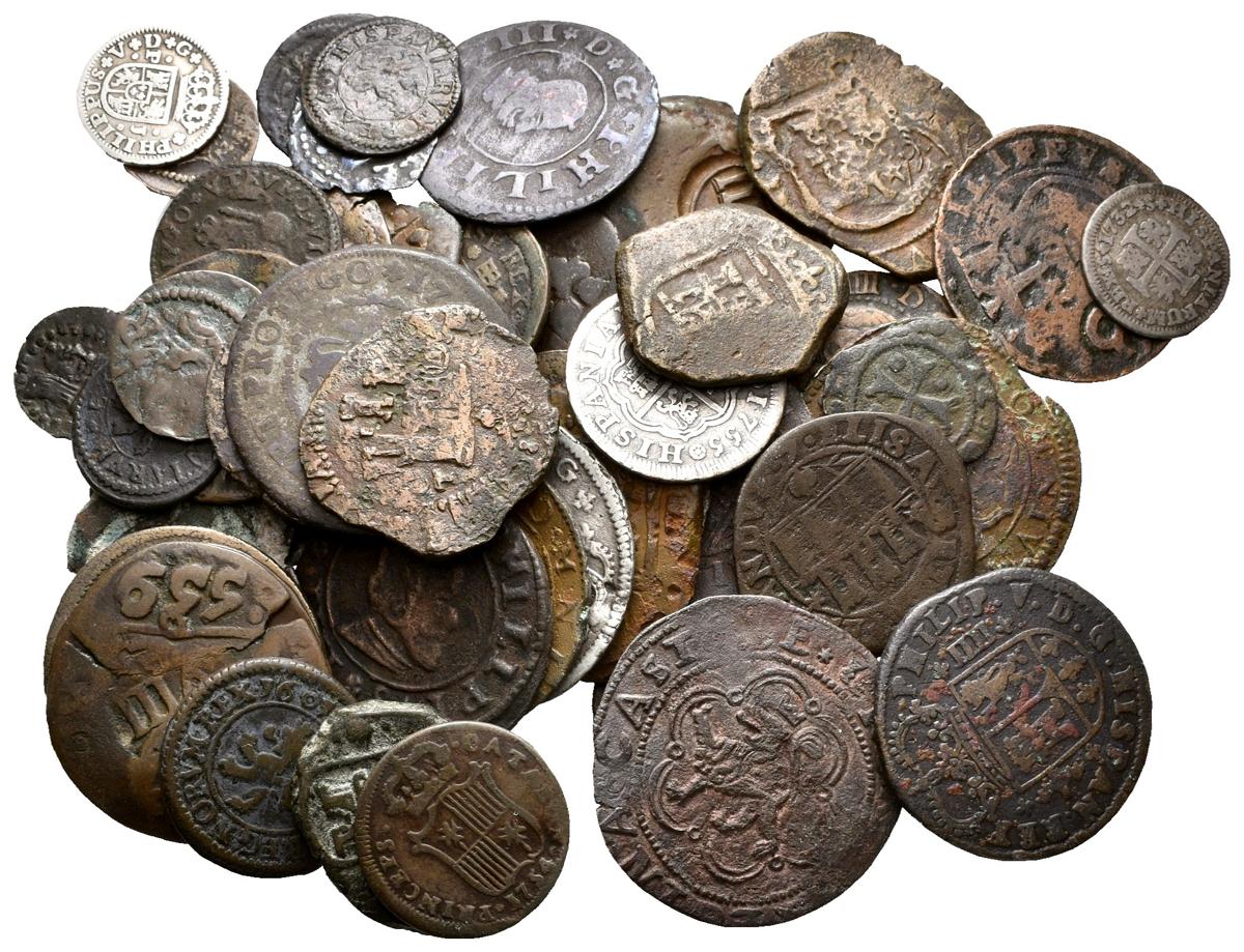 MONARQUIA ESPAÑOLA. Lote compuesto por 55 monedas, conteniendo: Reyes Católicos, Felipe II, Carlos II, Felipe III, Felipe IV, Felipe V, Fernando VI y Luis XIII, con variedad de fechas, valores y cecas (incluye: Santo Domingo, Navarra y Cataluña), principalmente de cobre además de 5 monedas de plata. Ar/Ae. RC/MBC. A EXAMINAR.